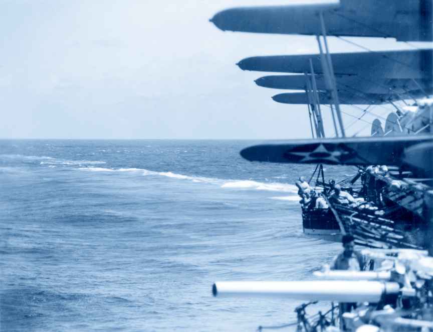 On Flight Quarters The USS Lexington making ready to launch aircraft on the search. Cleveland Edwards Photo, 1937.