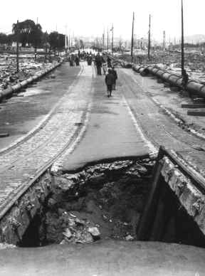 and streets caved into the ground. Collapsed masonry was