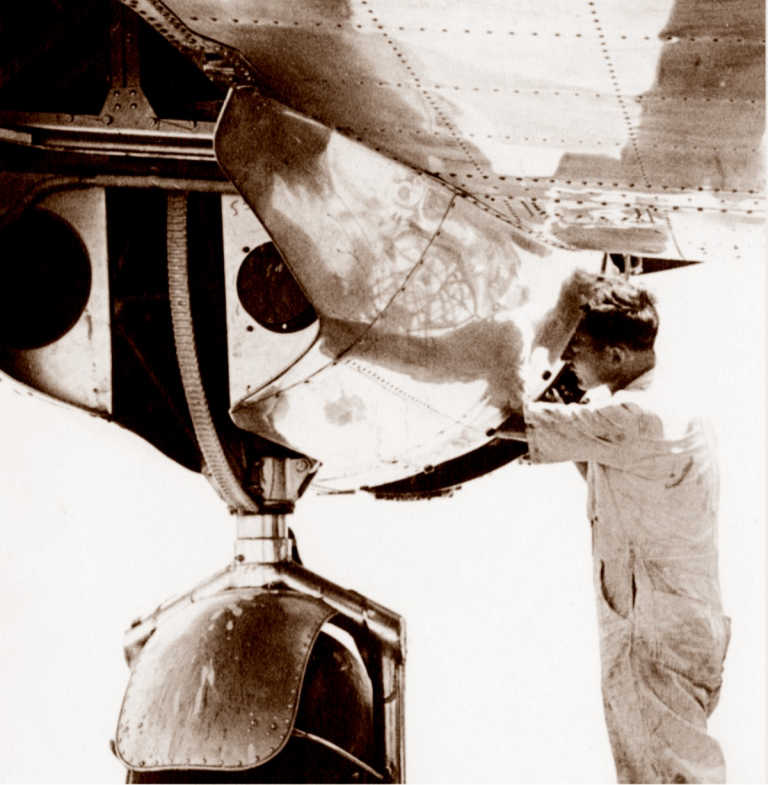 Bo McNeely inspects the wheel strut on Earhart's Electra