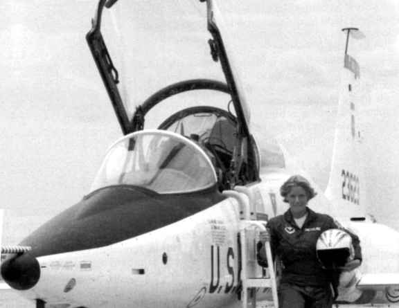Kathleen Creveling with her favorite aircraft the Northrop/Grumman T-38 Kathleen Creveling photo 1985.